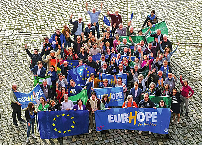 Die Delegierten legten sich kräftig ins Zeug und erhielten viele praktische Anregungen. Die gute Stimmung wurde beim traditionellen EUD/JEF-Familienfoto festgehalten. Das fröhliche Foto auf der Titelseite zeugt von dem Elan, mit dem unsere Verbände in den Endspurt zur Europawahl starten.